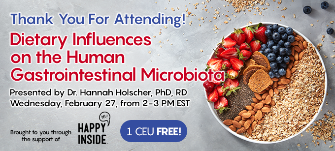 This complimentary 1-credit continuing education webinar is brought to you with support from HI! Happy Inside. Please note that HI! Happy Inside provided financial support only and did not have input into the information provided in this course. Dr. Hannah Holscher, PhD, RD, has the following relevant disclosures to report: she has received grants/research support from Abbott, Egg Nutrition Center, Foundation for Food and Agriculture Research, and Hass Avocado Board and has received honorarium from Kellogg's, National Cattlemen's Beef Association, National Honey Board, and Nutricia North America. She has certified that no conflict of interest exists for this program. View our disclosure policy.