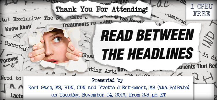This webinar was presented on Tuesday, November 14, 2017, from 2-3 pm ET, by Keri Gans, MS, RDN, CDN, and Yvette d'Entremont, MS (a.k.a. SciBabe).