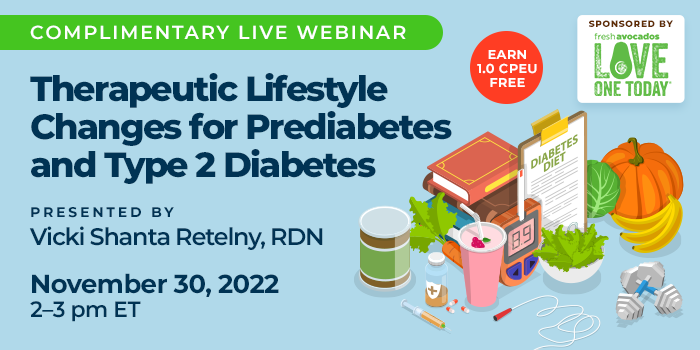 Join Vicki Shanta Retelny, RDN, on Wednesday, November 30, 2022, from 2-3 p.m. ET, for an interactive webinar that will take an evidence-based look at therapeutic lifestyle changes to help prevent and treat prediabetes and type 2 diabetes. Vicki will help you understand the latest guidelines on the role balanced nutrition, physical activity, sleep, and social life play in keeping blood sugar levels in a normal range over the lifespan. Learn the strategies your patients and clients can use to take charge of their prediabetes and diabetes management through daily lifestyle changes that will ultimately lead to improved health outcomes.