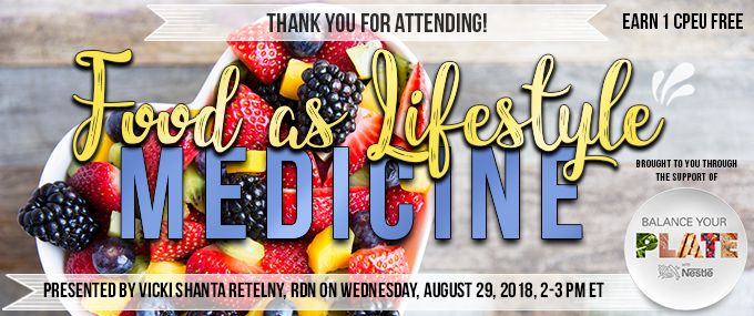 This webinar was presented on Wednesday, August 29, 2018, from 2-3 pm ET, by Vicki Shanta Retelny, RDN.
