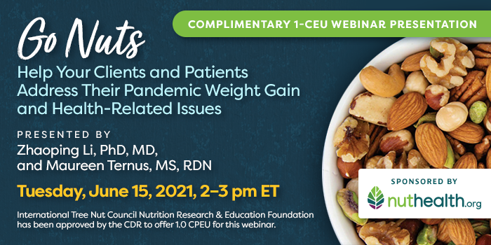 Presented by Zhaoping Li, MD, PhD, and Maureen Ternus, MS, RDN, this webinar on Tuesday, June 15, 2021, from 2-3 pm ET, will discuss the latest research on nuts and weight, diabetes and metabolic syndrome, as well as practical ways to incorporate nuts into a healthy diet.