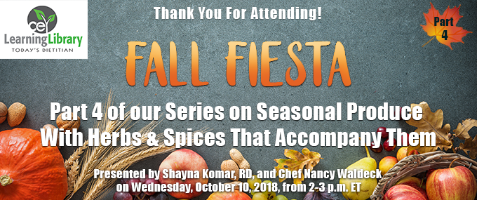 This webinar was presented on Wednesday, October 10, 2018, from 2-3 p.m. ET by Shayna Komar, RD, LD, and Chef Nancy Waldeck.