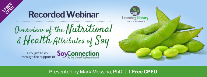 The live version of this webinar was presented by Mark Messina, PhD, on Wednesday, August 24, 2016, at 2 pm ET. This recorded version is approved for one hour of continuing education credit. RDs should list code 175 for this activity type.