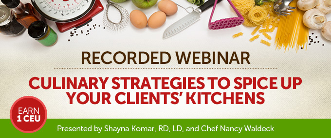 The live version of this webinar was presented by Shayna Komar, RD, LD, and Chef Nancy Waldeck on Wednesday, March 1, 2017, from 2-3 pm EST. This recorded version is approved for one hour of continuing education credit. RDs should list code 175 for this activity type.