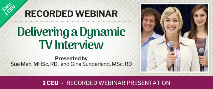 Listen, watch and learn from discussions and media interview videos featuring dietitians in action. With over 35 years of combined experience, media savvy dietitians Sue Mah, MHSc, RD, and Gina Sunderland, MSc, RD, will share their media coaching tips, real life experiences and secrets for success to help you develop your media skills and boost your confidence in working with the media. Don't miss this great opportunity to learn from two recognized media experts!