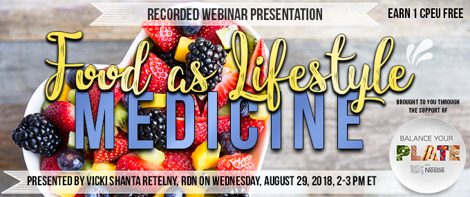 This complimentary 1-credit continuing education webinar is brought to you with support from Balance Your Plate with Nestlé. Please note that Balance Your Plate with Nestlé provided financial support only and did not have input into the information provided in this course. Vicki Shanta Retelny, RDN, reports the following relevant disclosures: she is consultant dietitian for Northwestern Memorial Hospital and Health Maintenance Institute, as well as a media communications consultant for a variety of food brands, including American Pecan Council, Cherry Marketing Institute, Eat Smart Salads, Egg Nutrition Center, Illinois Farm Families, Wonderful Brands and Zespri Kiwifruit. She has certified that no conflict of interest exists for this program. View our dislosure policy.