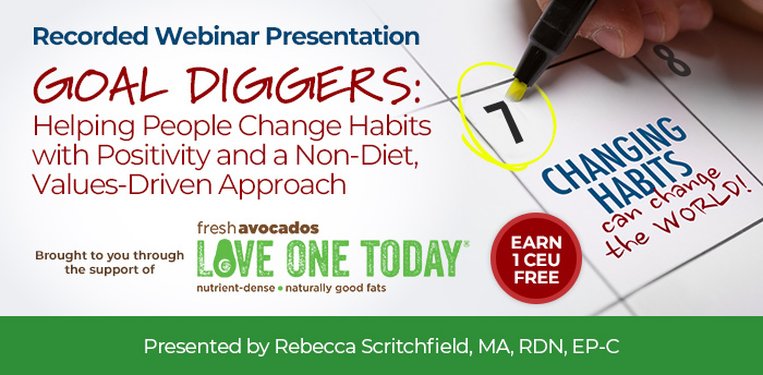 The live version of this webinar was presented by Rebecca Scritchfield, MA, RDN, EP-C, on Wednesday, March 7, 2019, from 2-3 pm ET. This recorded version is approved for one hour of continuing education credit. RDs should list code 175 for this activity type.